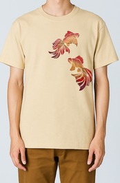 型染めと手描きの金彩仕上げで仕立てた、涼しげな金魚の柄のTシャツです。