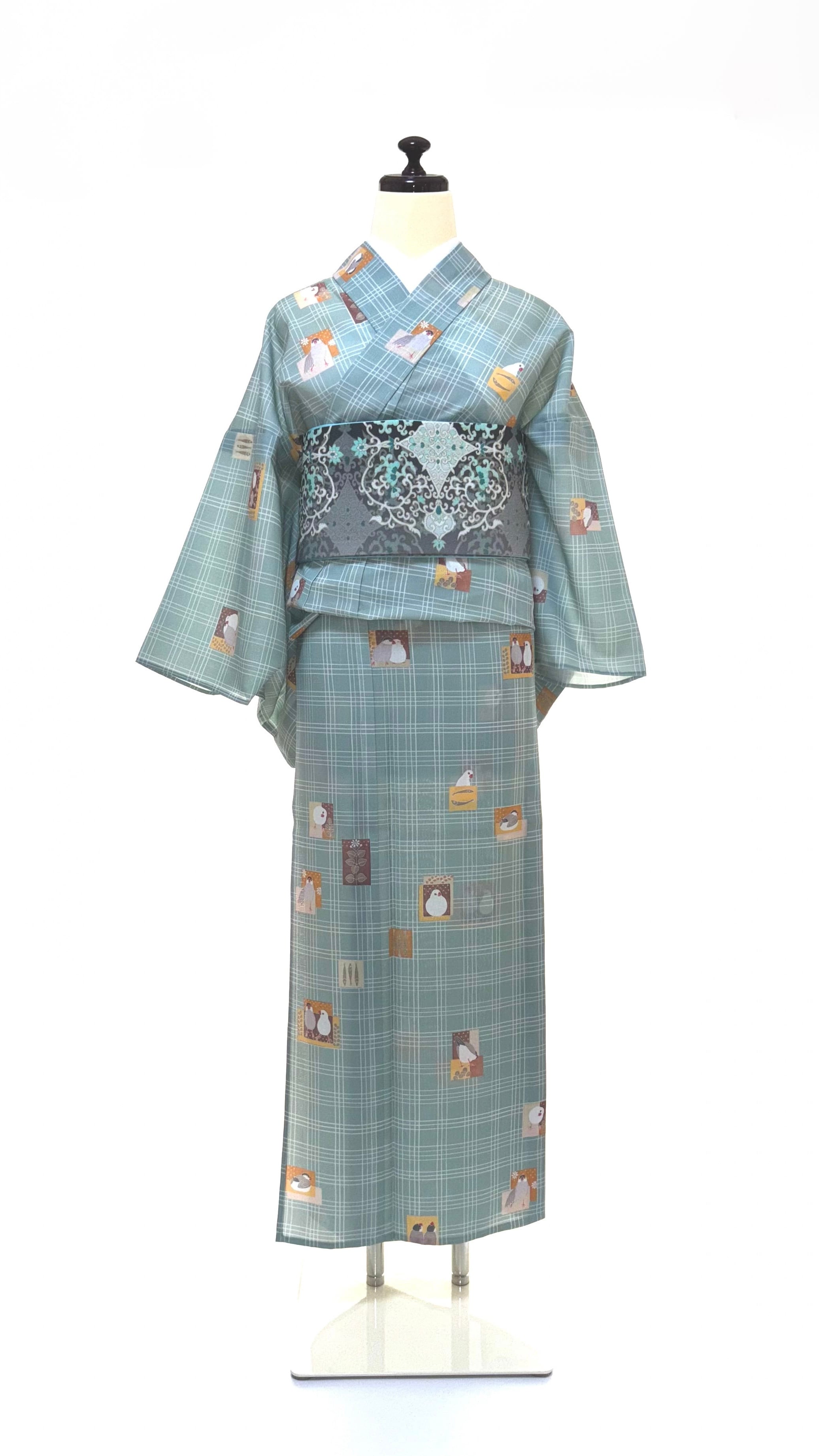 【受注・フルオーダー】some-pri 単衣着物「かわいい文鳥」チェック柄付下げ小紋 青磁色