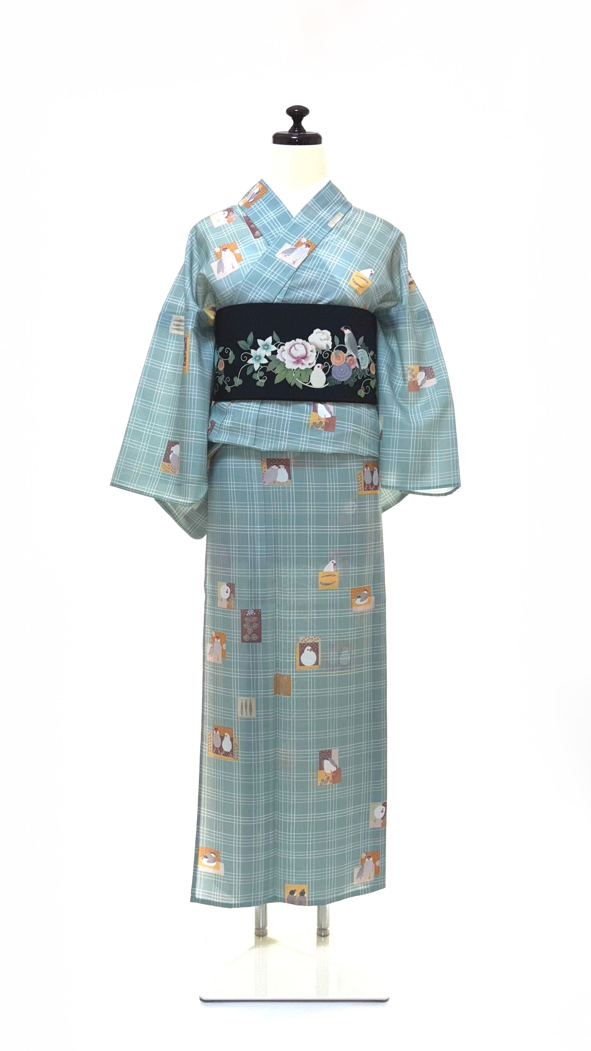 【即納品】some-pri 単衣着物「かわいい文鳥」チェック柄付下げ小紋 青磁色