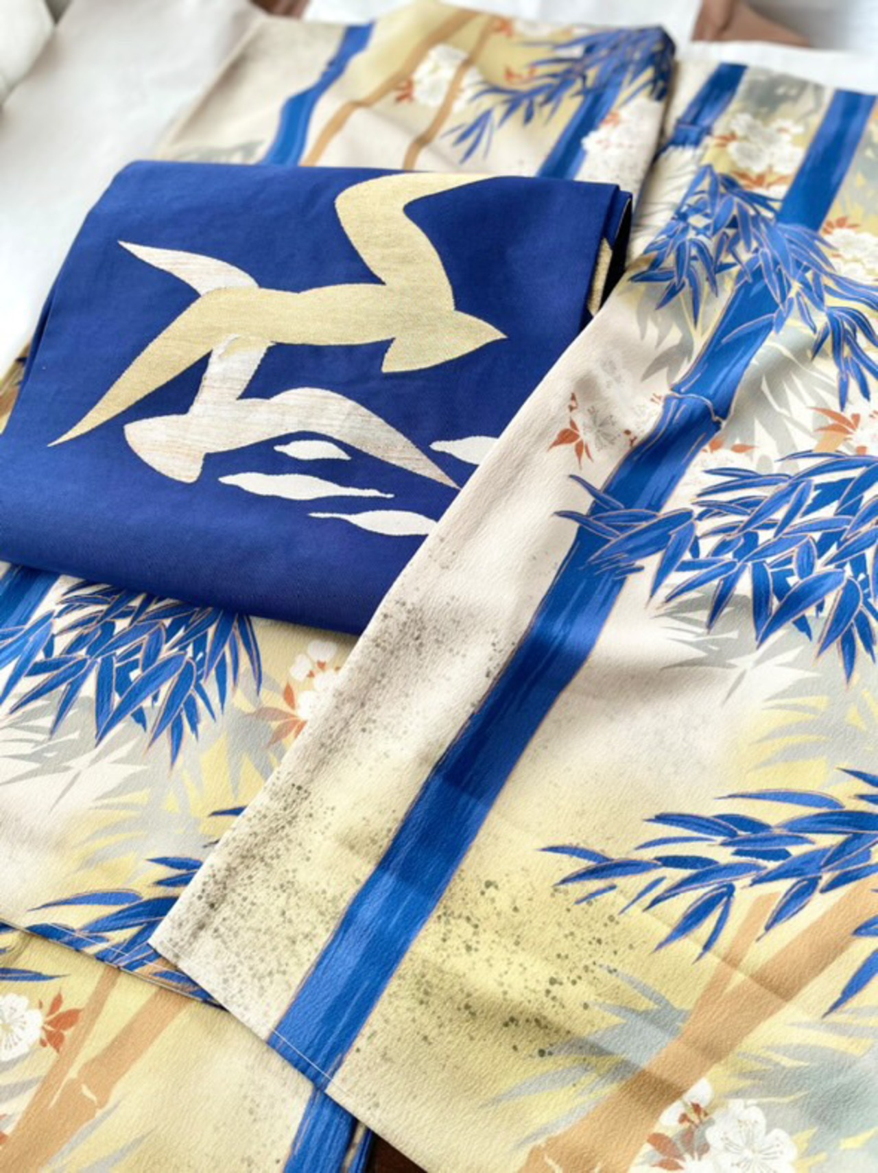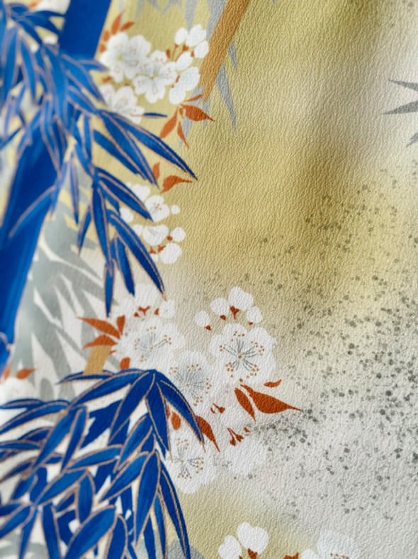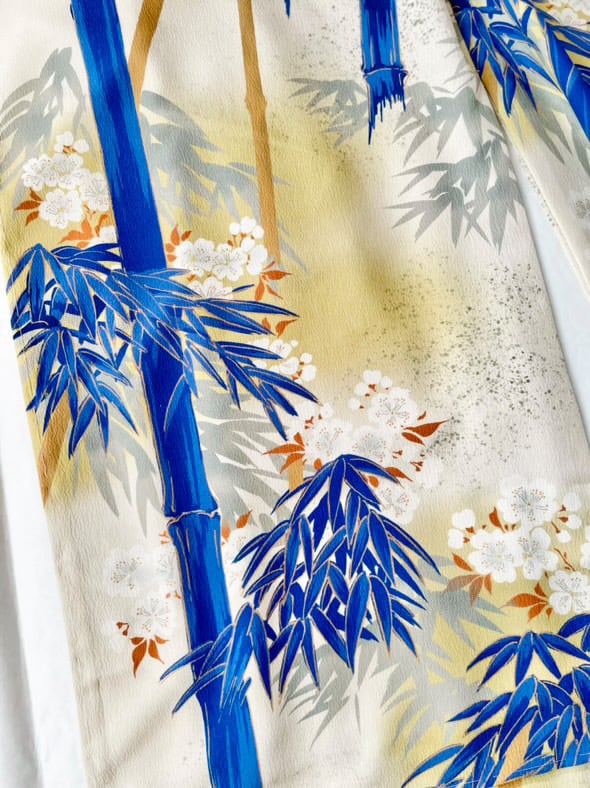 青竹のすっきりとした意匠に、控えめな桜が添えられた上品な小紋です。