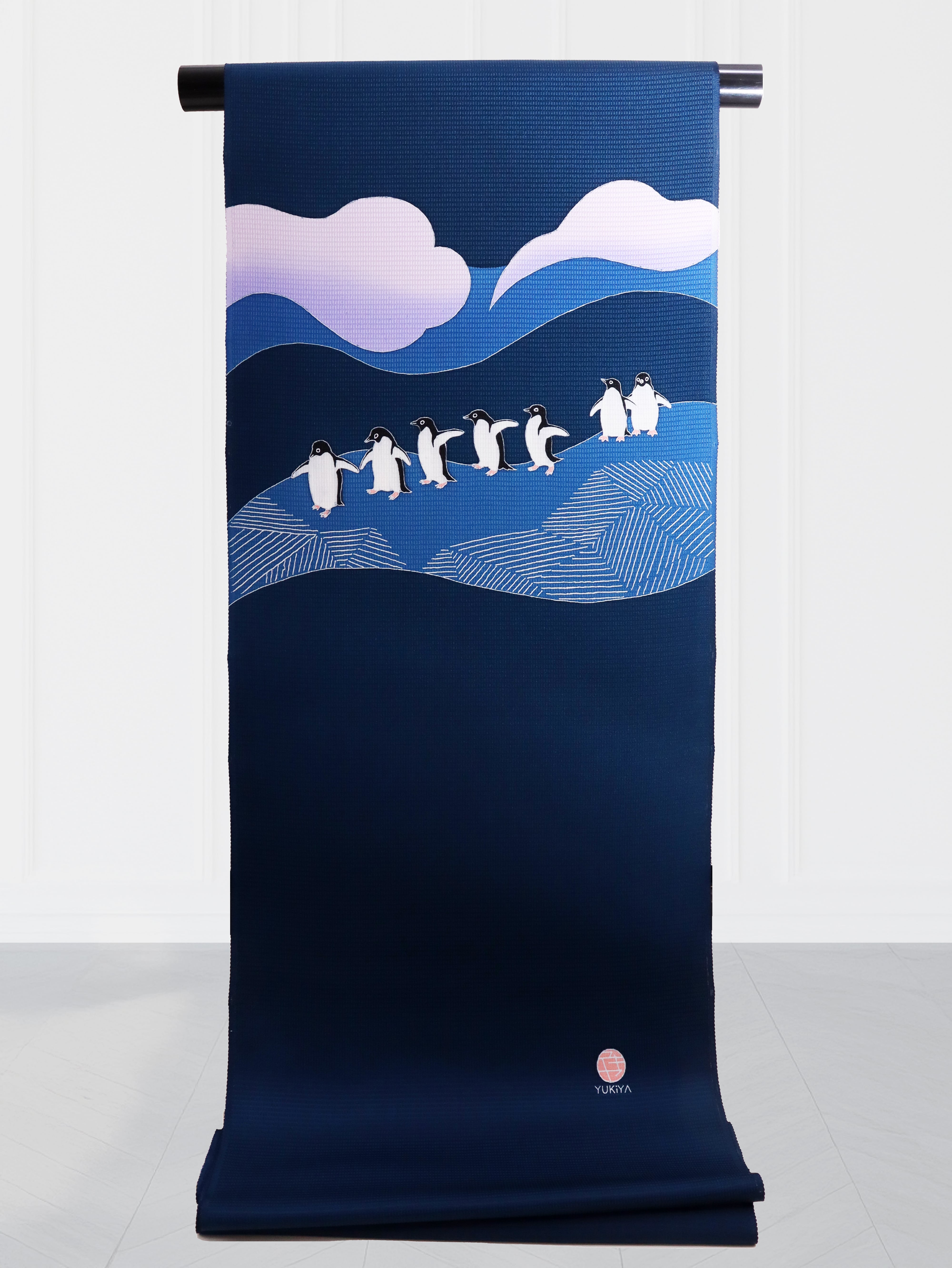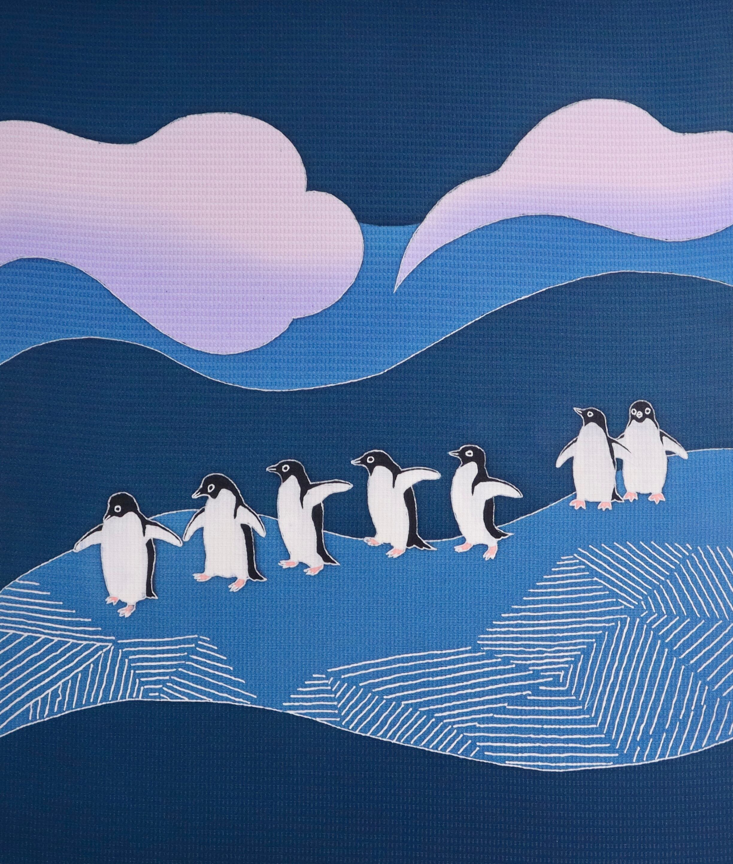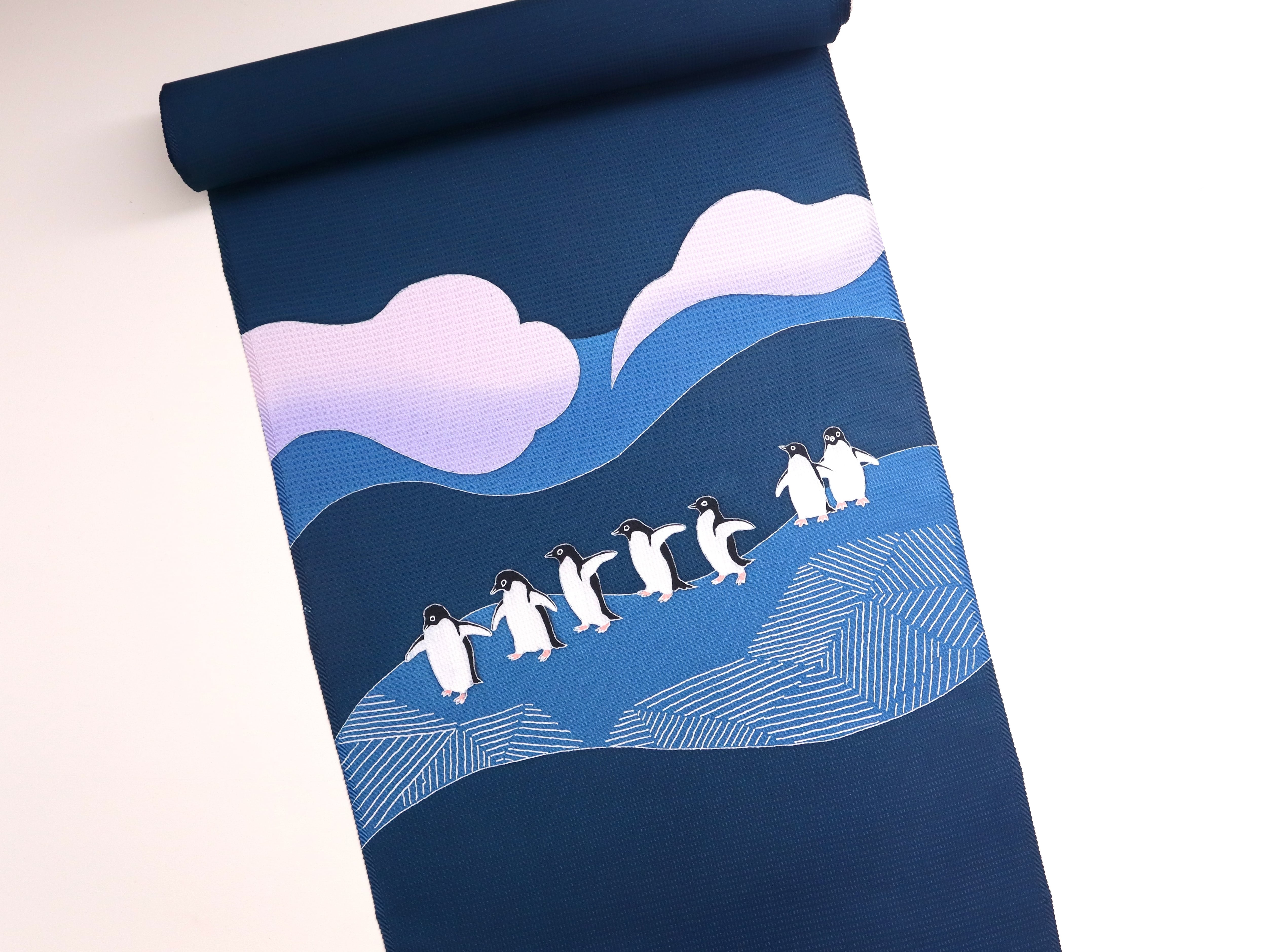 お太鼓には、かわいらしいペンギンたちが行列をなして歩く様子を染めで表現しました。