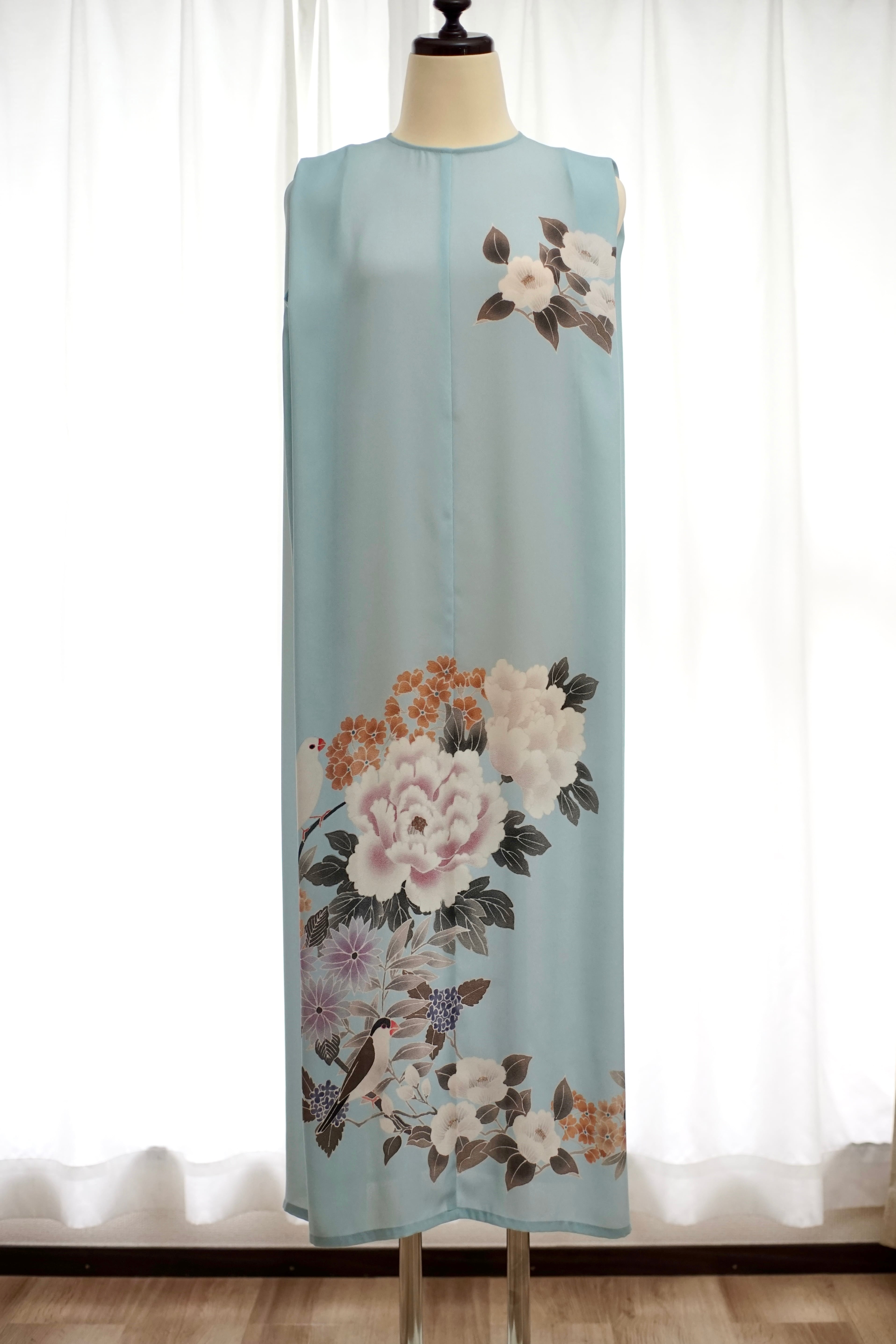 本作は、職人の手による友禅の反物をデータ化し、高品質なデジタル捺染で再現。梨地タッチのさらさらとした生地感は、肌にやさしく、着心地の良さを実感していただけます。すとんと落ちるストレートシルエットが、女性らしい上品な佇まいを演出。水色を基調に、訪問着を思わせる絵羽柄で富の象徴とされる牡丹や菊、文鳥を華やかに表現しました。