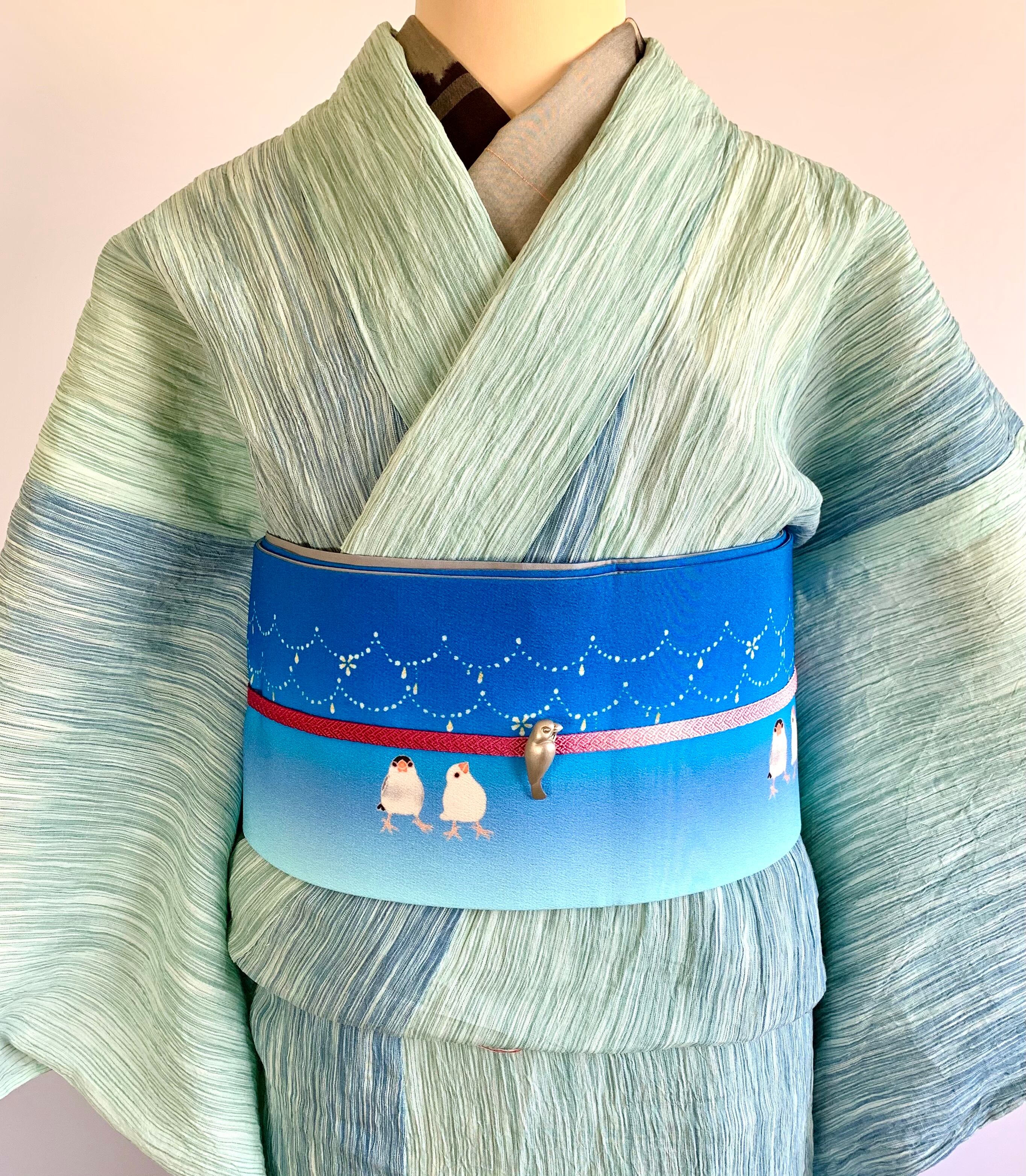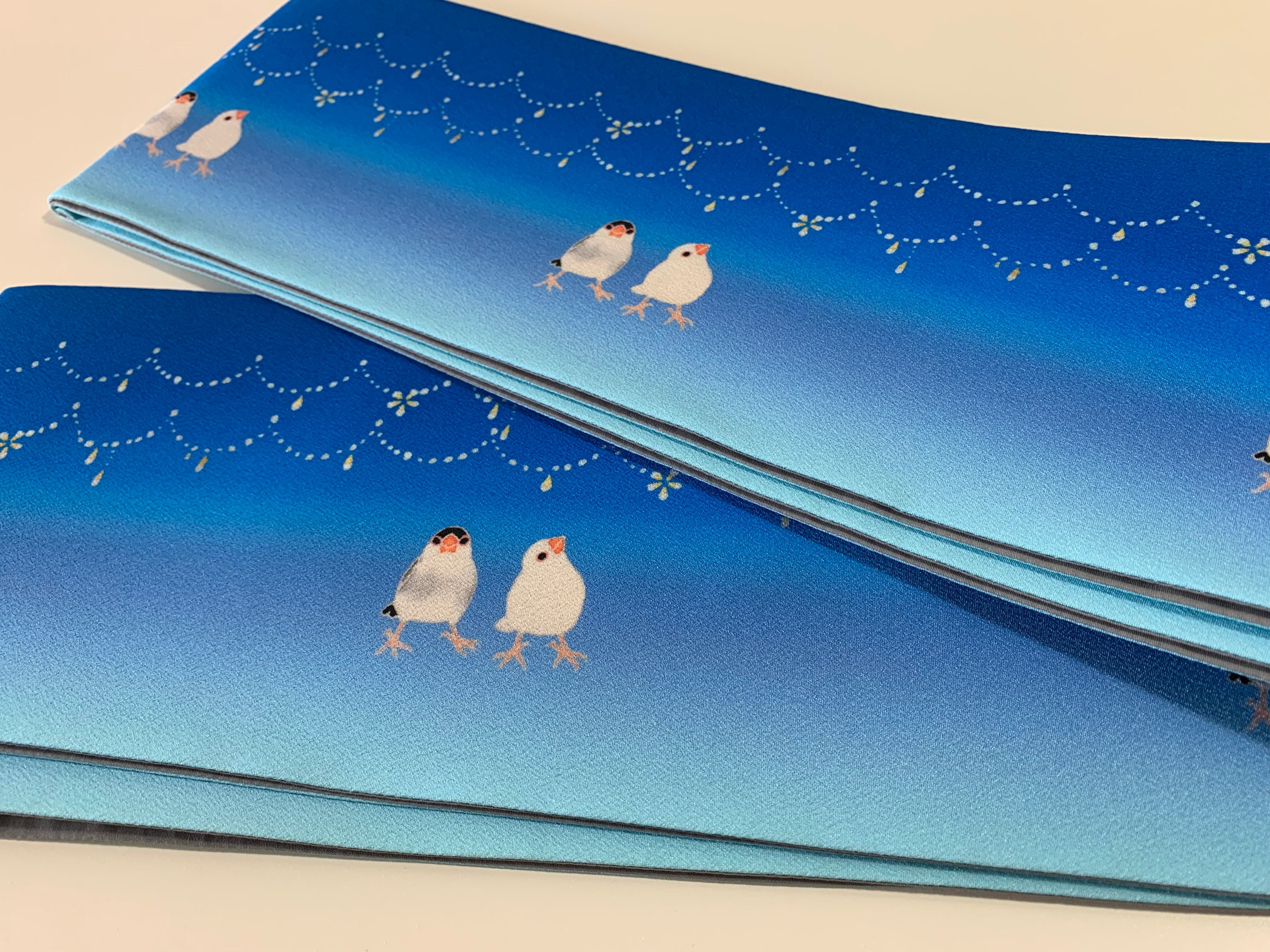 ユキヤオリジナルデザインの文鳥たちを半幅帯にプリントしました。