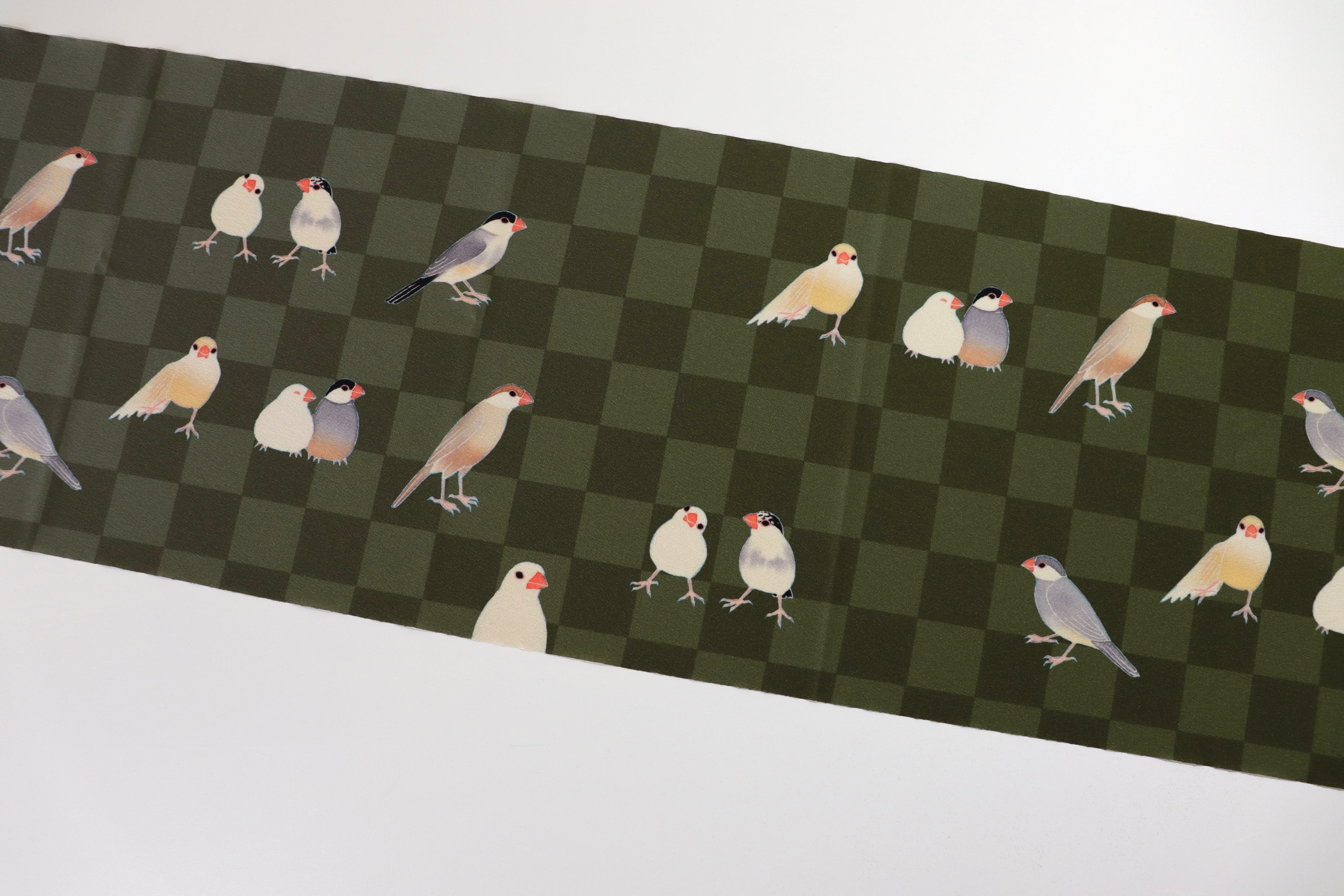 帯揚「文鳥図鑑」市松模様 黄土色×カーキ