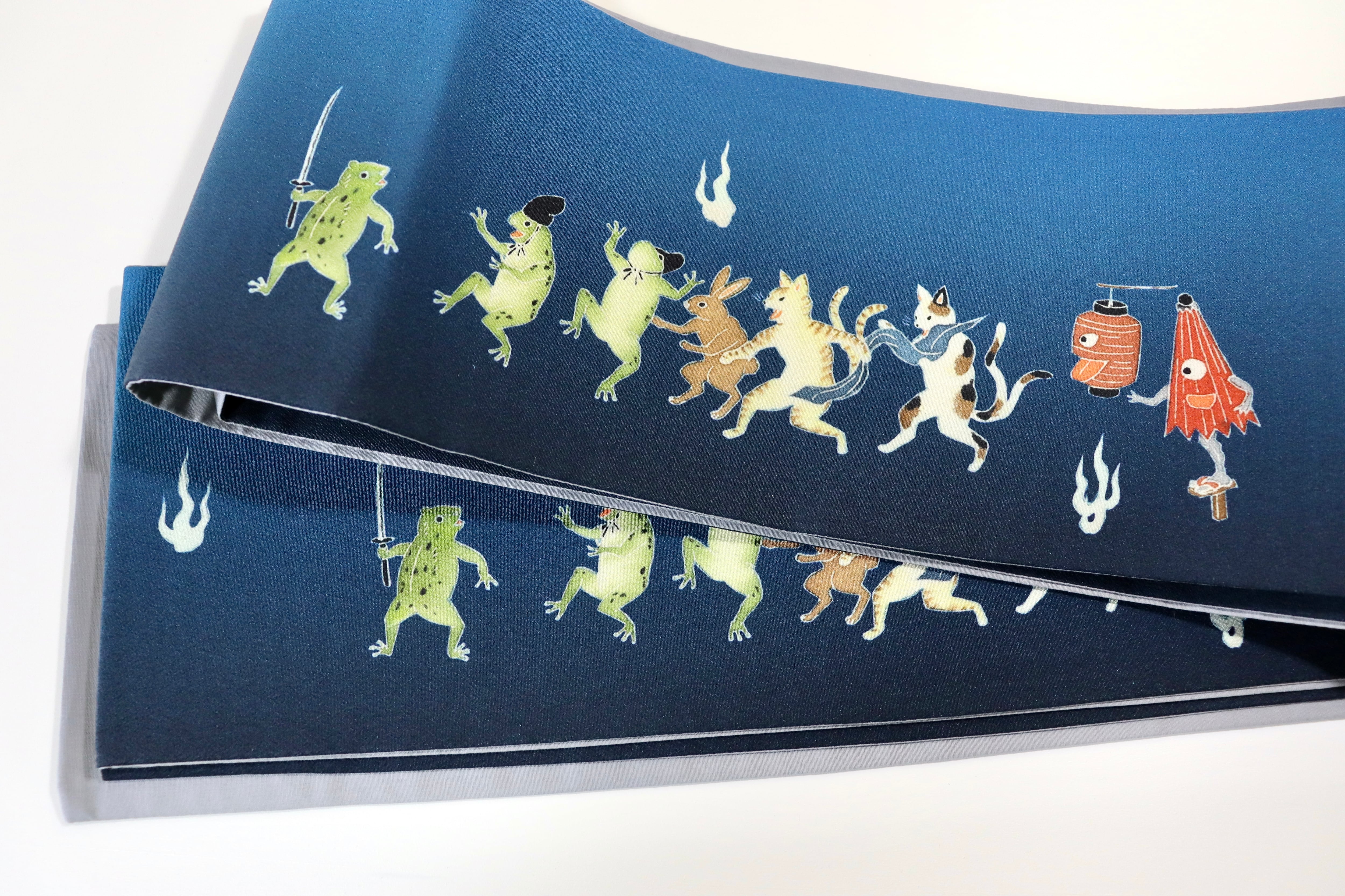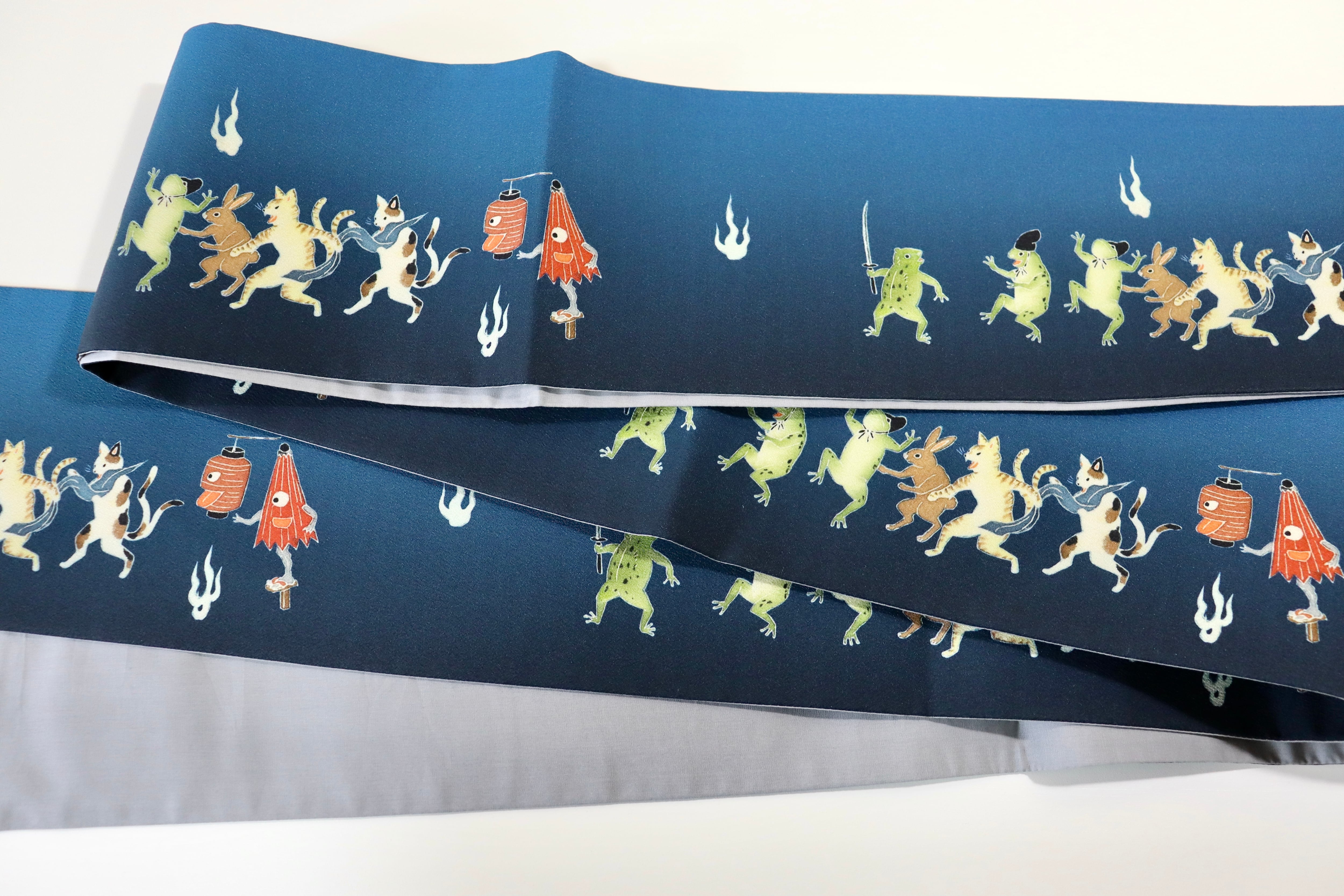 往来でカエルたちが刃物を持ち出す騒ぎを起こしています。野次馬のウサギや妖怪たち。ハロウィンや浴衣のコーディネートにぴったりの半幅帯です。