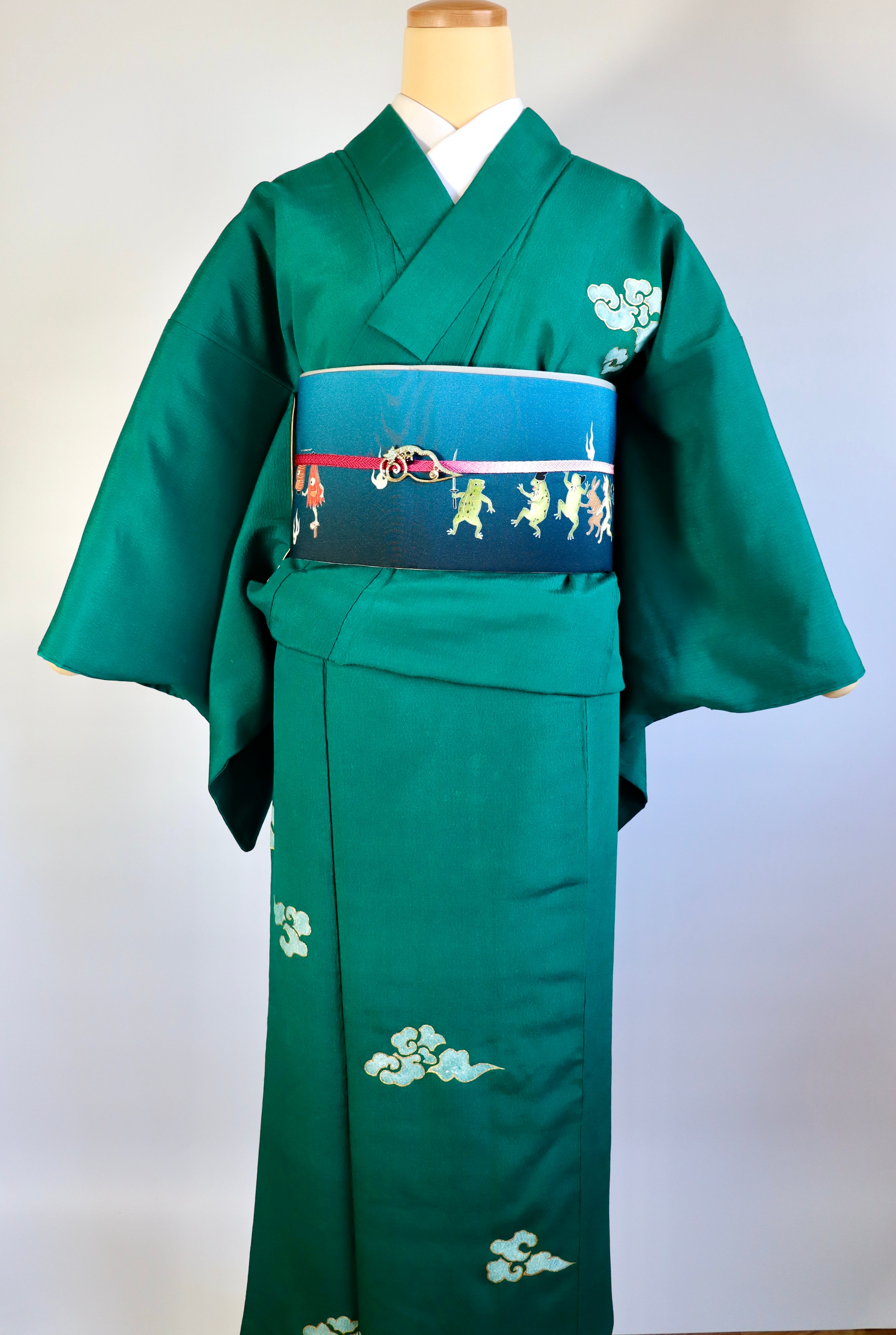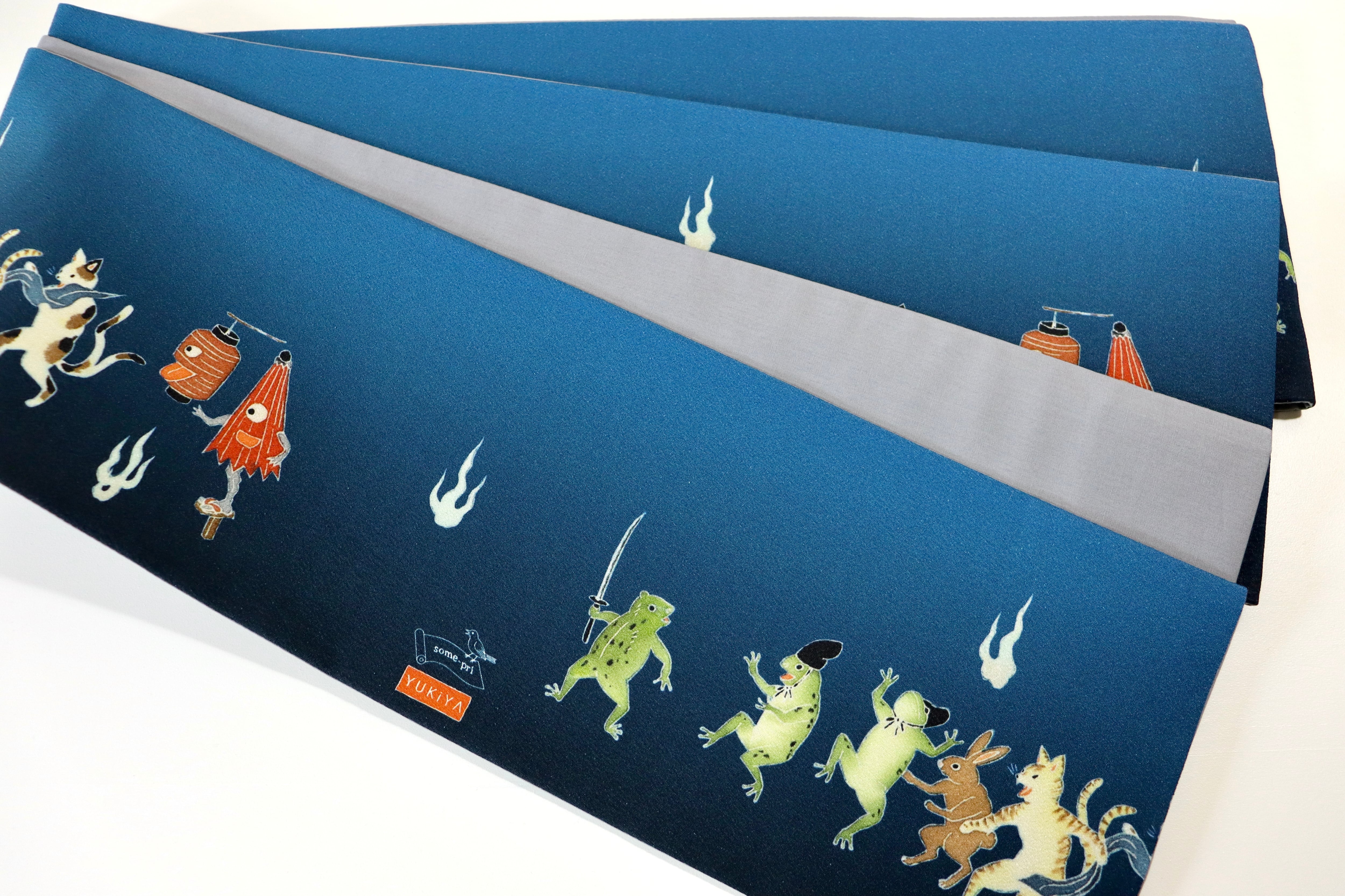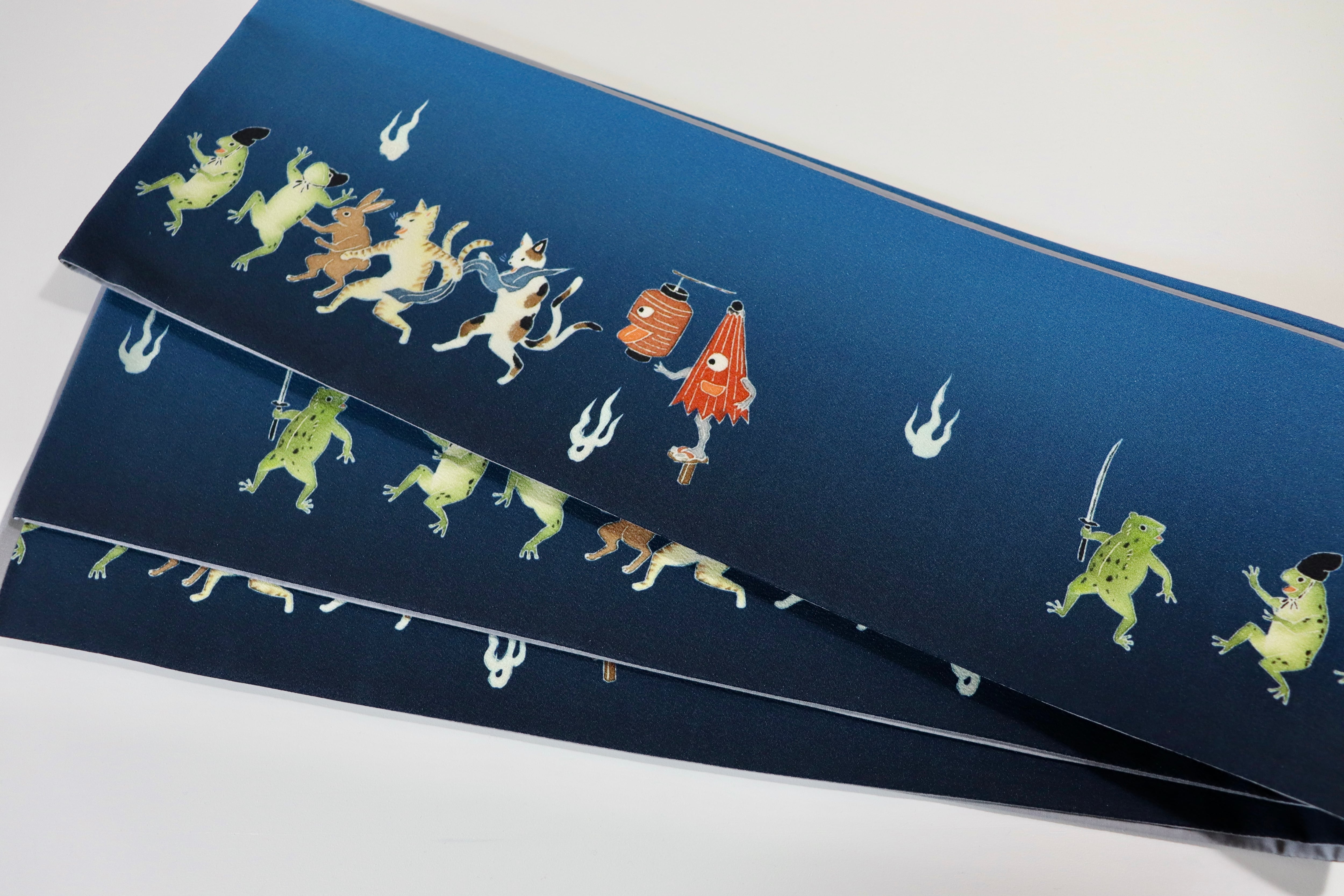 往来でカエルたちが刃物を持ち出す騒ぎを起こしています。野次馬のウサギや妖怪たち。ハロウィンや浴衣のコーディネートにぴったりの半幅帯です。